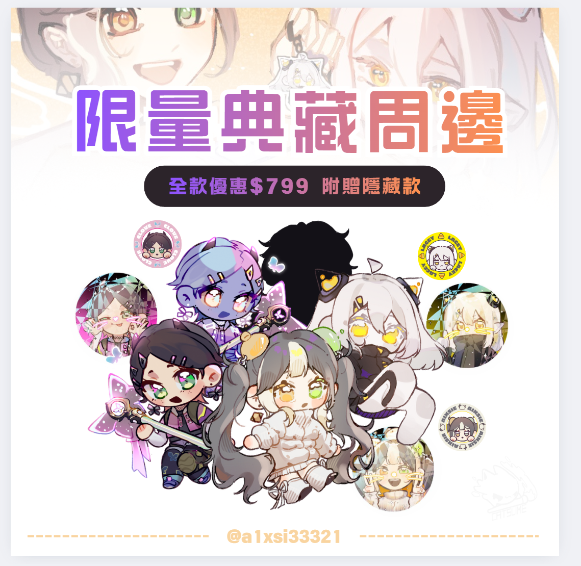 立即購買 專屬DC交流群 購買後不孤單 周邊多優惠 買多打折/抽獎活動 超值優惠套組 優惠價格 購買限量收藏品商品專區套組-玉米糖 $299吊飾*1、徽章*1、胸章*1、身分證明*1、胸章收納盒*1 See Collection 尚餘 0 49件套組-艾熙 $299吊飾*1、徽章*1、胸章*1胸章收納盒*2 See Collection 尚餘 0 57件套組-搗蛋鬼 $299吊飾*1、徽章*1角色貼紙*4、徽章收納盒*1 See Collection 尚餘 0 48件 此套組加贈 隱藏款立牌&徽章 預購優惠大禮包商品內容物- 艾熙套組- 玉米糖套組- 珂樂芙套組- 隱藏款30mm徽章- 隱藏款50mm鑰駛圈 立刻購買 典藏商品 本次預購結束(12月底)後,以下物品將不再販售 天 小時 分鐘 秒 特價 加入購物車 立牌 玉米糖套組評分 0 滿分 5 NT$328 原始價格:NT$328。NT$299目前價格:NT$299。 加入購物車 立牌 珂樂芙套組評分 0 滿分 5 NT$299 加入購物車 立牌 阿熙套組評分 0 滿分 5 NT$299 特價 加入購物車 徽章 徽章套組評分 0 滿分 5 NT$328 原始價格:NT$328。NT$299目前價格:NT$299。